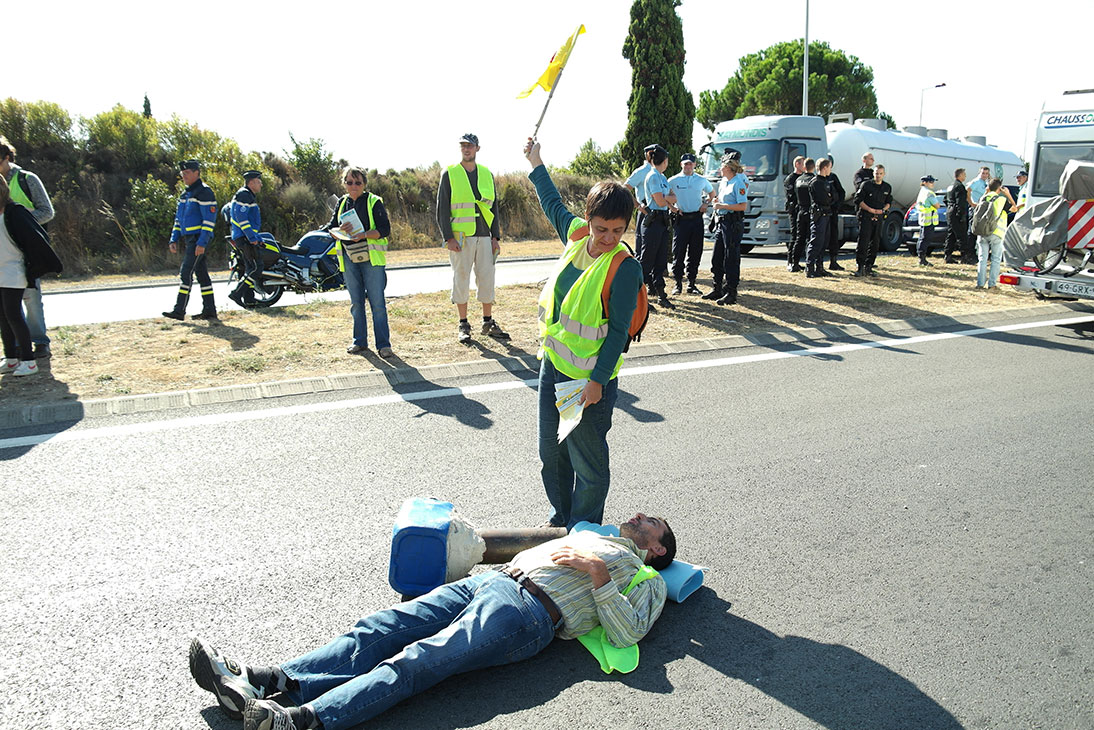 Cinq voies ouvertes, tract ci-joint, banderoles “Contre la LGV – No Tav”, “Trop c’est trop”, “Péage prix libre”.