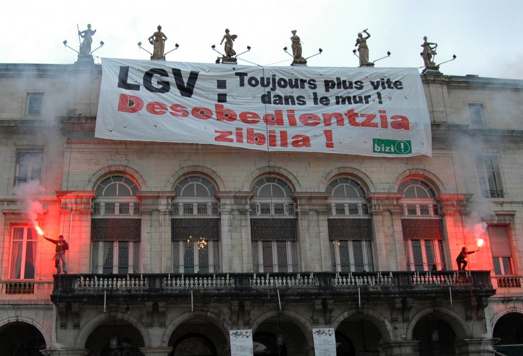60 militants ont suspendu une grande banderole “+ de trains ! – de camions ! Pollutaxe maintenant ! ” sur un pont surplombant l’autoroute, juste après le péage de Biarritz. Les manifestants étaient équipés de drapeaux basques et de masques blancs anti-pollution, symbole de leur mouvement.