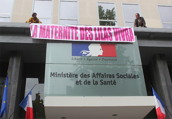 Le Parisien le 7 mai 2014 - Les larges lettres roses tranchent avec le gris de la façade du ministère de la Santé, à Paris. «La maternité des Lilas vivra», assure la banderole déployée ce mercredi en soutien à cette maternité de Seine-Saint-Denis, qui doit être transférée à Montreuil. Une action bien rodée : les grimpeurs sont passés à l'action pendant que des sages-femmes détournaient l'attention des forces de l'ordre.