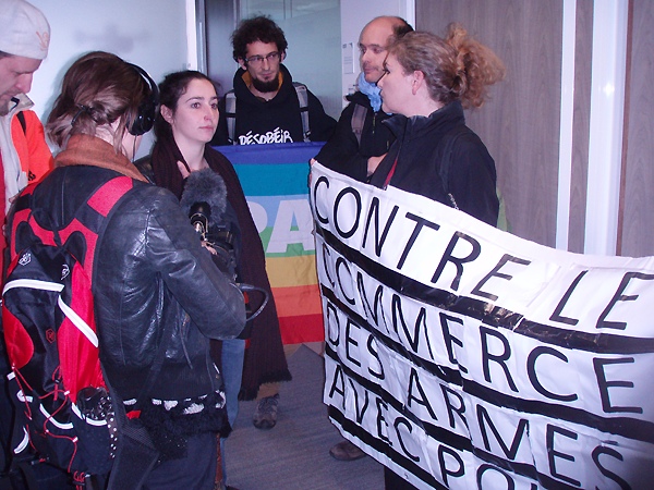 Une quinzaine de militants ont fait irruption dans les bureaux et ouvert la discussion avec les personnes présentes. Opacité totale : aucun responsable n'a voulu répondre aux questions posées, notamment sur les garanties que Safran/Sagem doit fournir à l'état et à la population sur la non réexportation vers la Syrie du matériel fourni à la Russie.