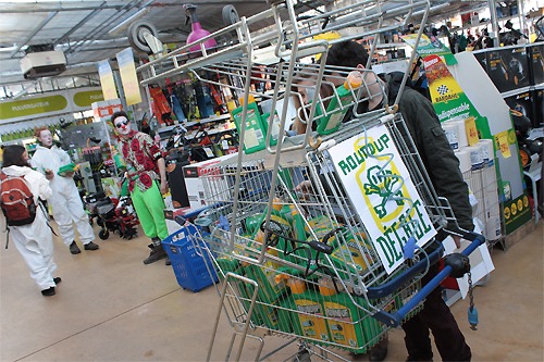 Paris le 6 mai 2014 - La campagne Roundup Non Merci, contre la vente de Roundup à destination des jardiniers amateurs, enregistre sa première victoire à Paris. Après plusieurs actions dans le magasin Castorama situé métro Crimée à Paris, les militants écologistes ont eu la bonne surprise de découvrir que le Roundup a été supprimé des étalages par le directeur! Comme quoi la lutte paye... Les militants souhaitaient donc féliciter en personne le directeur, qui n'a cependant pas voulu leur parler. Il faut dire que le magasin continue à vendre des herbicides contenant du glyphosate, substance active et toxique du Roundup.
