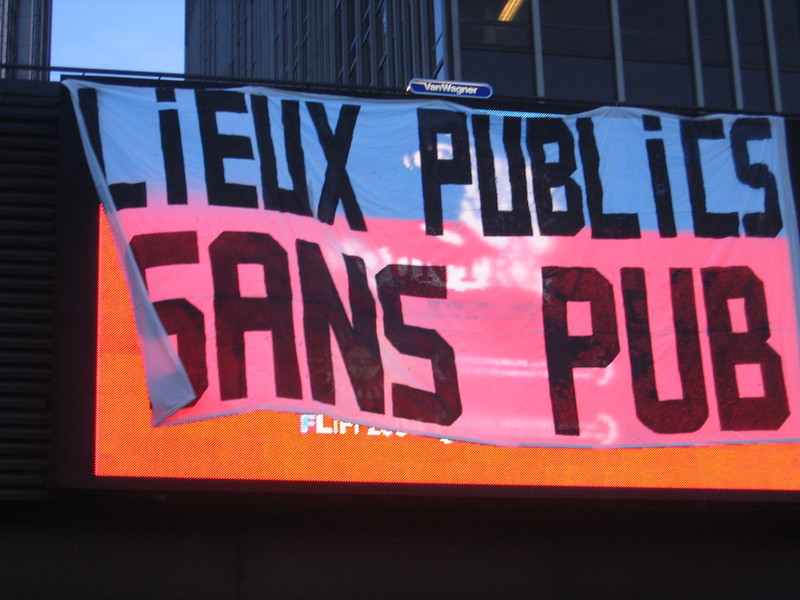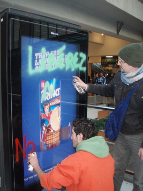 Action du 30 novembre 2013 à Paris gare du Nord : Cette action de désobéissance civile contre le système publicitaire avait pour objectif d’alerter la population sur l’envahissement de l’espace public par les écrans publicitaires numériques. Ces supports publicitaires étant encore plus agressifs, encore plus polluants, encore plus énergivores, encore plus liberticides que les autres modèles déjà existants.