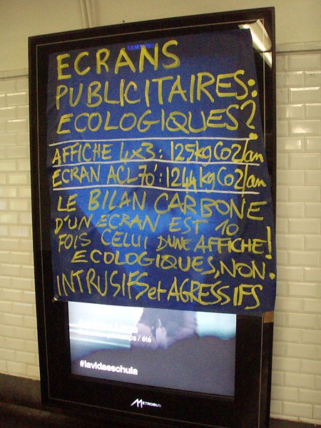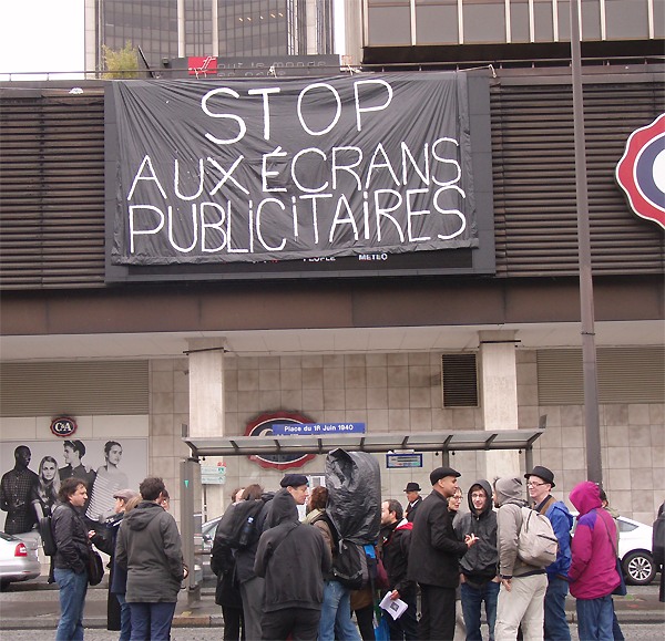 Dès le matin, une grande bâche a été déployée sur l'écran géant de Montparnasse, rééditant l'action de 2009 contre cet écran. D'autres actions antipublicitaires ont suivi toute la journée.