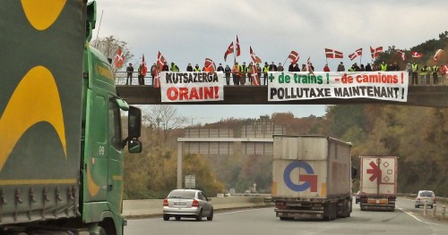 60 militants ont suspendu une grande banderole “+ de trains ! – de camions ! Pollutaxe maintenant ! ” sur un pont surplombant l’autoroute, juste après le péage de Biarritz. Les manifestants étaient équipés de drapeaux basques et de masques blancs anti-pollution, symbole de leur mouvement.