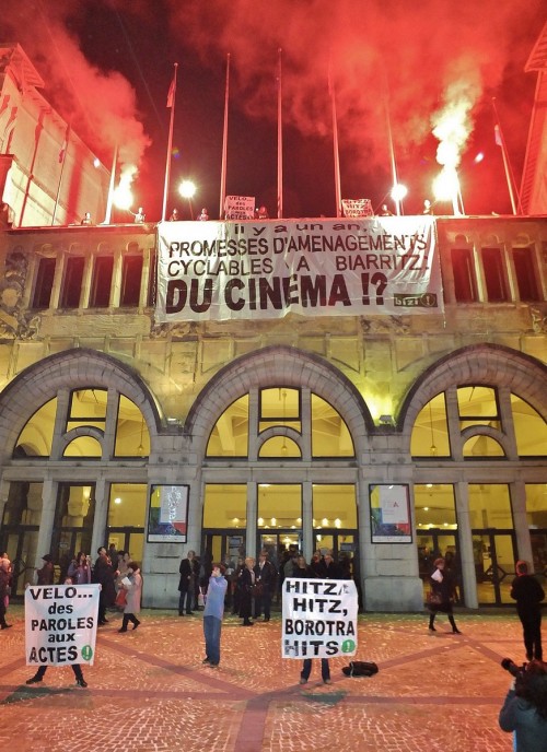 Ce samedi 26 janvier à 19h30, 25 militant-e-s du mouvement altermondialiste Bizi ! ont déployé une grande banderole sur la façade de la gare du Midi à Biarritz avec un message en clin d’œil au festival audiovisuel FIPA dont c’était la cérémonie du palmarès et de clôture au même moment. Cette banderole disait : « Il y a un an, promesses d’aménagements cyclables à Biarritz : du cinéma ?! ». Pendant ce temps, d’autres militants distribuaient des tracts au public présent expliquant le sens de cette action.