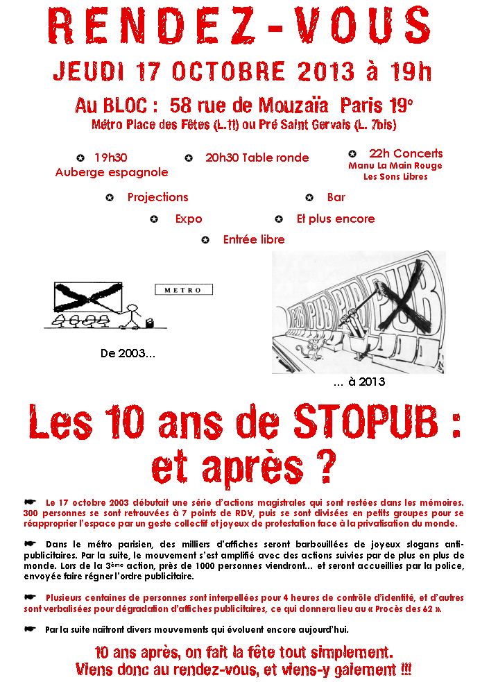 | 28 Janvier 2011 | Paris : 50ème action du collectif des déboulonneurs de publicité : descente dans le métro pour barbouiller les nouveaux écrans ACL. Rendez-vous à 19h à la sortie du métro Opéra (lignes 3, 7 et 8) devant les marches de l’Opéra. | ||