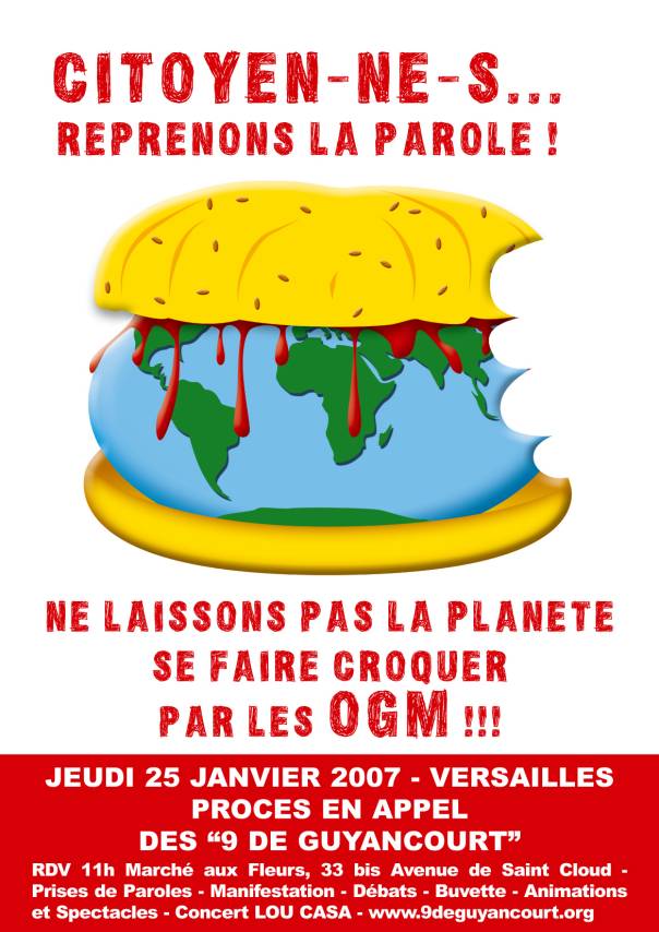 | Sam. 24 Mars 2007 | Paris : un jeu de piste militant et costumé. Samedi, le premier jour de 6 semaines internationales d'actions d'information sur les OGM Point de rendez-vous : Fontaine des Innocents, Place Joachim du Bellay, Métro Les Halles (Porte Lescot) à 11h00 du matin. Et n'oubliez pas de signer la pétition demandant un moratoire sur la culture d'OGM : www.moratoireogm.fr |